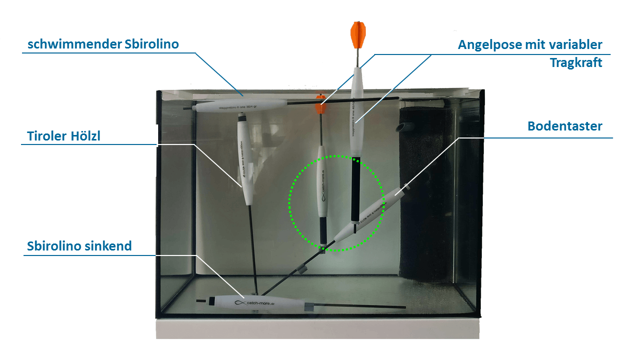 Ob Sbirolino schwimmend oder sinkend, Angelpose ausbleien "bleifrei" mit einem Handgriff, mit der Empfindlichkeit eines Wagglers und auf Grund mit den Vorteilen eines Tiroler Hölzchen oder eines Bodentasters mit einer einzigen Montage.